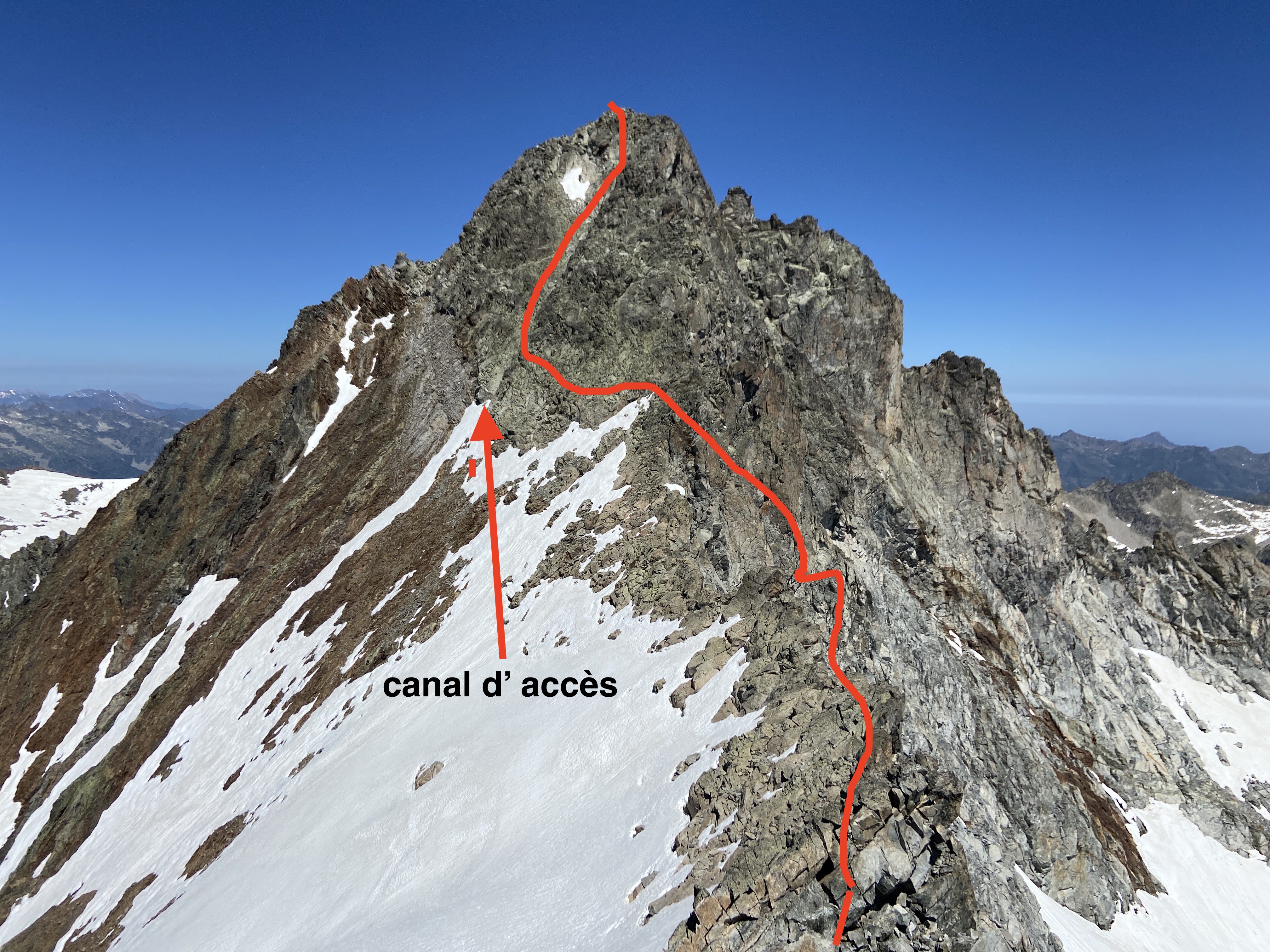 És un cim preciós, ja des de lluny és maco. Un cop a dalt convè mirar cap a Oest per mirar on hem d' anar. Hem d'anar a buscar un coll amb unes pedres vermelles que es veu des del cim, per fer-ho baixarem pel mateix lloc i un cop en aquest coll anirem pel fil de l' aresta vers Oest, és fàcil, la roca en aquest 2 tram de cresta no és tant bona com del Maou al pic Long, però es fa bé. No baixeu més del compte que sinó tindreu un percal de nassos !!